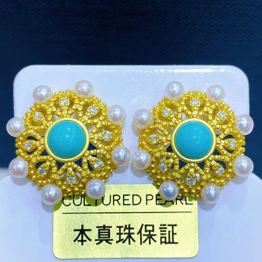 Natural Turquoise Lace Carved 2.5-3mm Pearl Stud Earrings